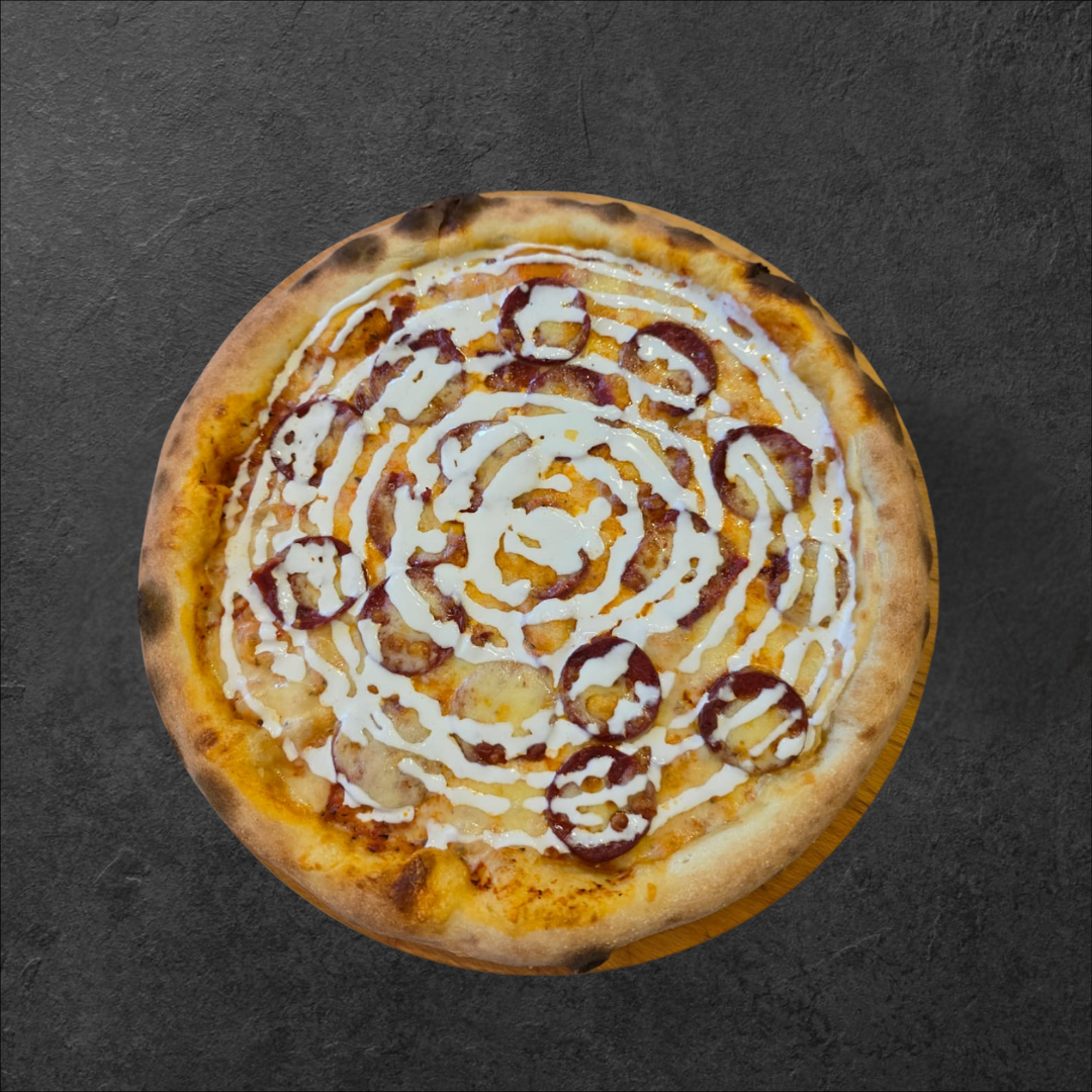 Tomatao sauce, gouda, mozzarella, spicy sausage, panna.