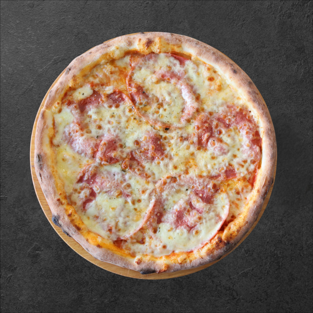 Tomatao sauce, gouda, mozzarella, beef ham, musherooms, olives, oregano.